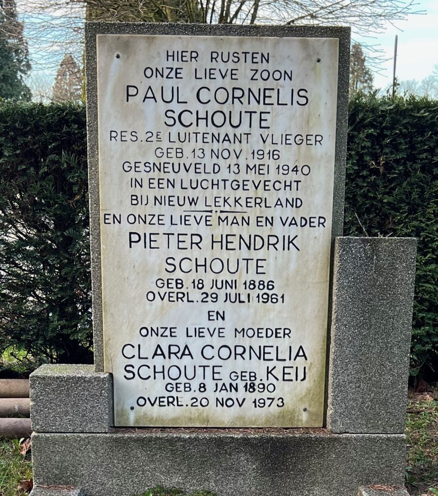 Paul is overleden/gedood als hij samen met een ander toestel, beide G-1’s horen bij de 4e Jacht Vliegtuig Afdeeling (4e JaVA) hun opdracht was: naar Schiphol vliegen om de daar gestationeerde Fokker T.5 no.856 te begeleiden op een bombardementsvlucht’, onderweg daar heen wordt plots de formatie aangevallen door een overmacht aan Duitse Messerschmitts, de G-1 krijgt voltreffers en stort brandend neer bij NieuwLekkerland waarbij de tweekoppige bemanning Paul Schoute en Han Lindner (neergeschoten door de Duitse ME 109 piloot Karl Ebbinghausen) op 13 Mei 1940, hij is geërd met het Oorlogsherinneringskruis (OHK) en het Vlieger Kruis.