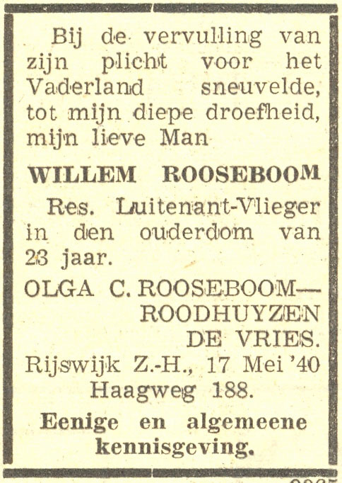 Willem is overleden/gedood toen hij met zijn Fokker 606 in gevecht raakte met twee Duitse jagers boven Nieuwerkerk. Het toestel, dat slechts bewapend is met een “Lewis” mitrailleur, probeert tevergeefs om in de wolken te ontsnappen waarschijnlijk is hij tijdens het gevecht dodelijk getroffen waarna het vliegtuig neerstort op 10 Mei 1940,  hij is geërd met het Oorlogsherinneringskruis (OHK) en posthum met het Vliegerkruis.
